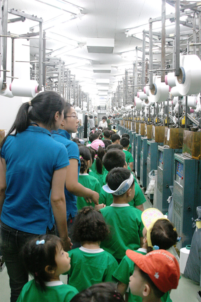 실을 이용해서 스타킹이 짜여지는 기계실에서 ….. 와~~~ 신기하다.