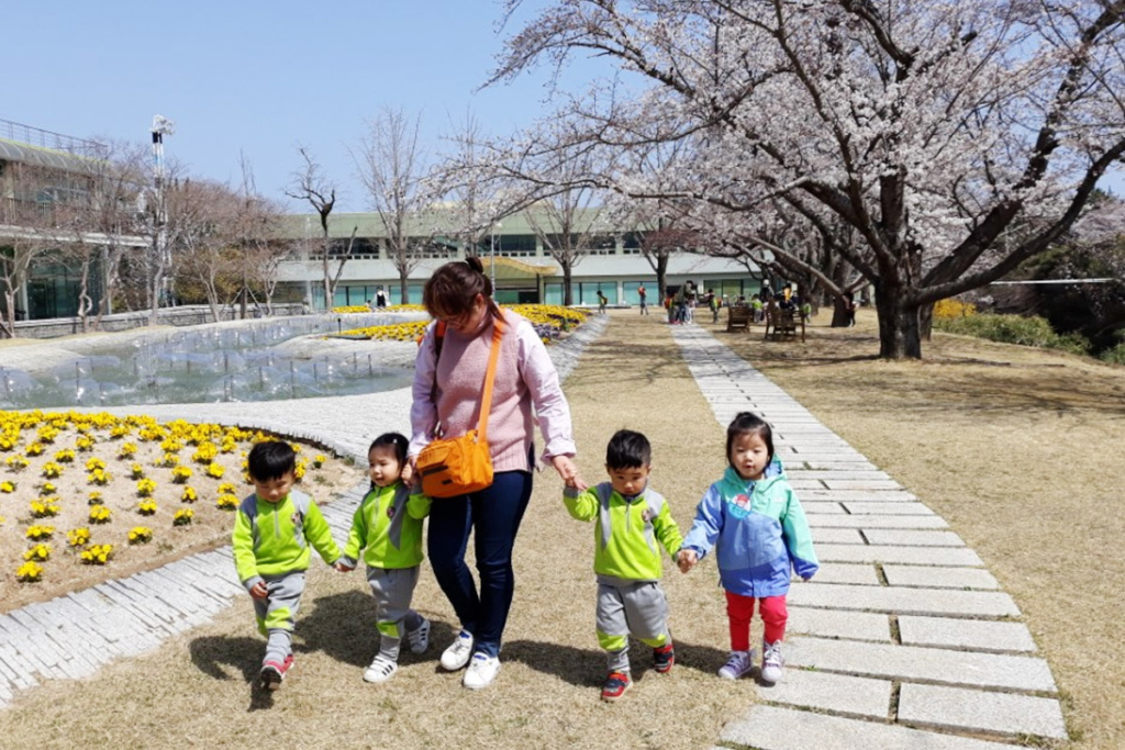 벚꽃이 핀 신앙촌분수대앞에서~ 선생님과 산책을하며 힐링하는 어린이들^^